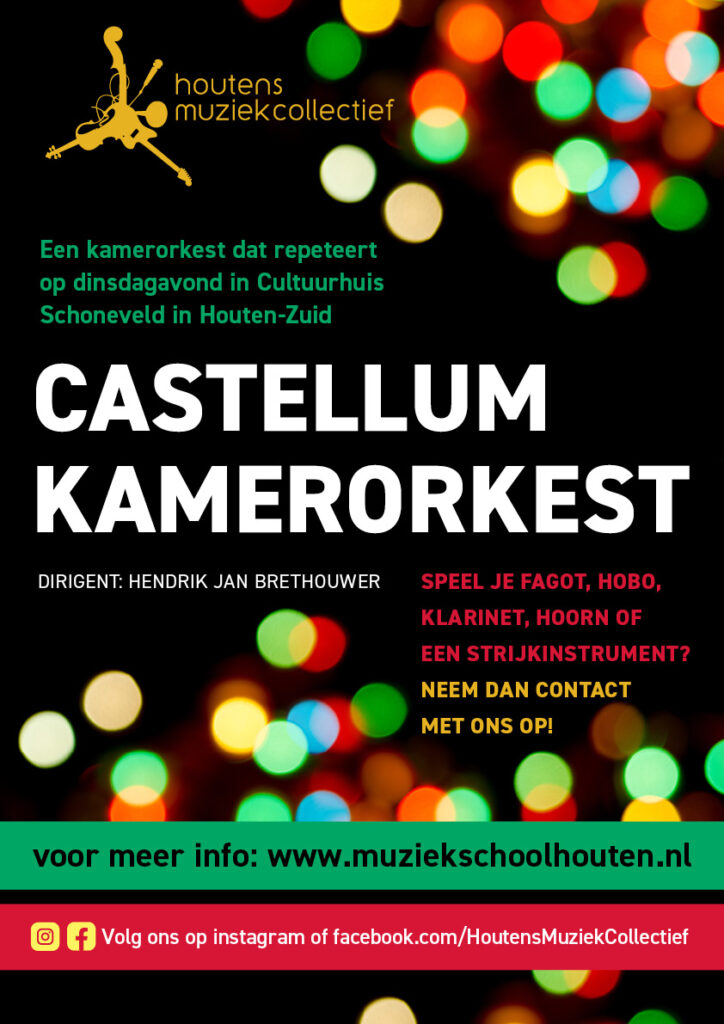 Het Castellum Kamerorkest speelt wekelijks op dinsdagavond in Cultuurcentrum Schoneveld in Houten-Zuid. Op de lessenaar staat een breed en toegankelijk repertoire. Het orkest staat onder leiding van dirigent Hendrik Jan Brethouwer.