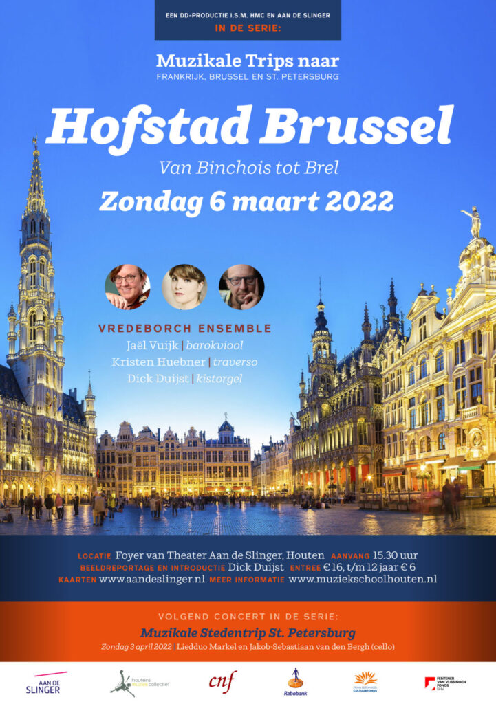 Het Vredeborch Ensemble vervolgt deze serie met het programma Hofstad Brussel / van Binchois tot Brel, met muziek van componisten die de verschillende bloeiperiodes van Brussel tot leven brengen.